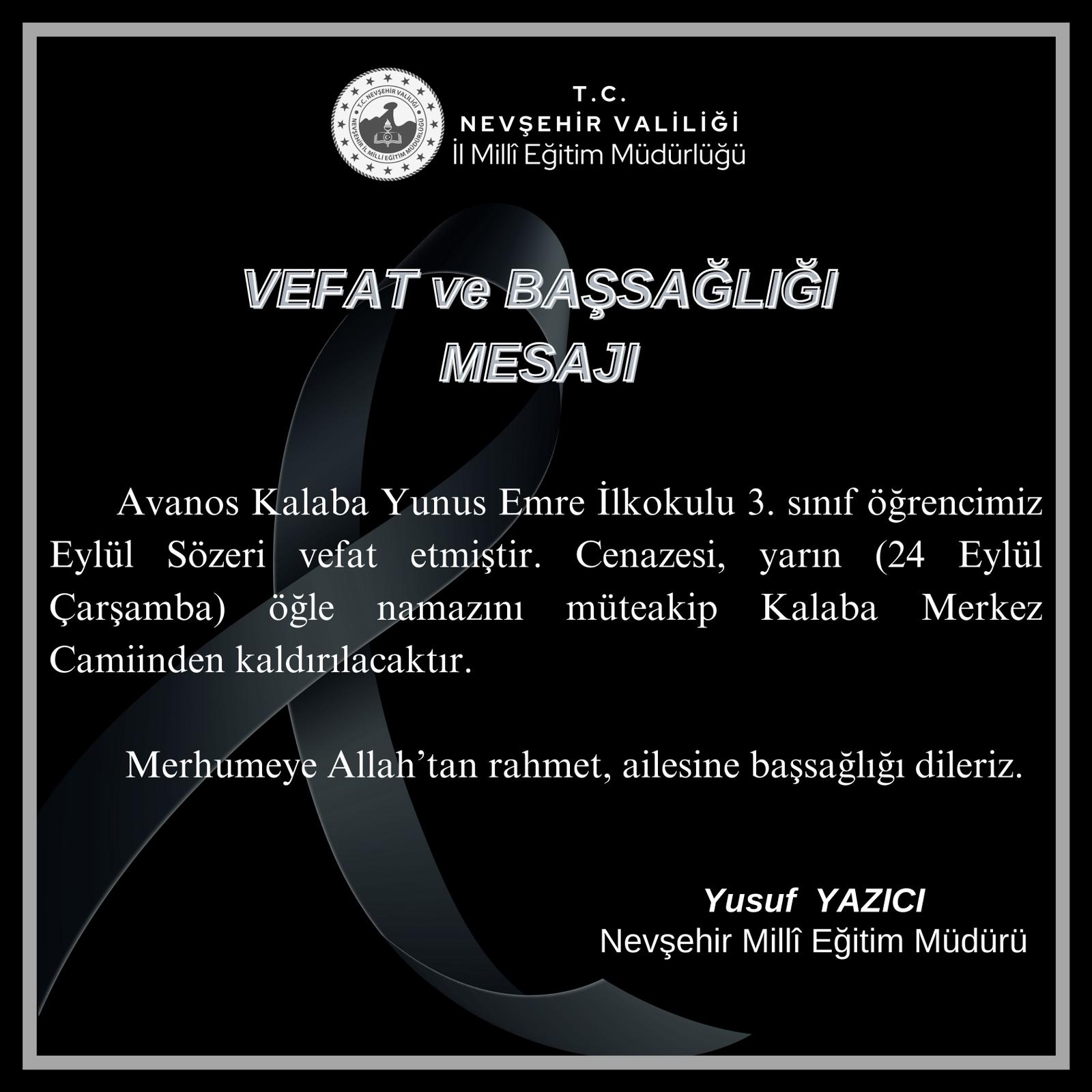 Avanos Kalaba Yunus Emre İlkokulu 3. sınıf öğrencimiz Eylül Sözeri vefat etmiştir. Cenazesi, yarın (24 Eylül Çarşamba) öğle namazını müteakip Kalaba Merkez Camiinden kaldırılacaktır. Merhumeye Allah'tan rahmet, ailesine başsağlığı dileriz.