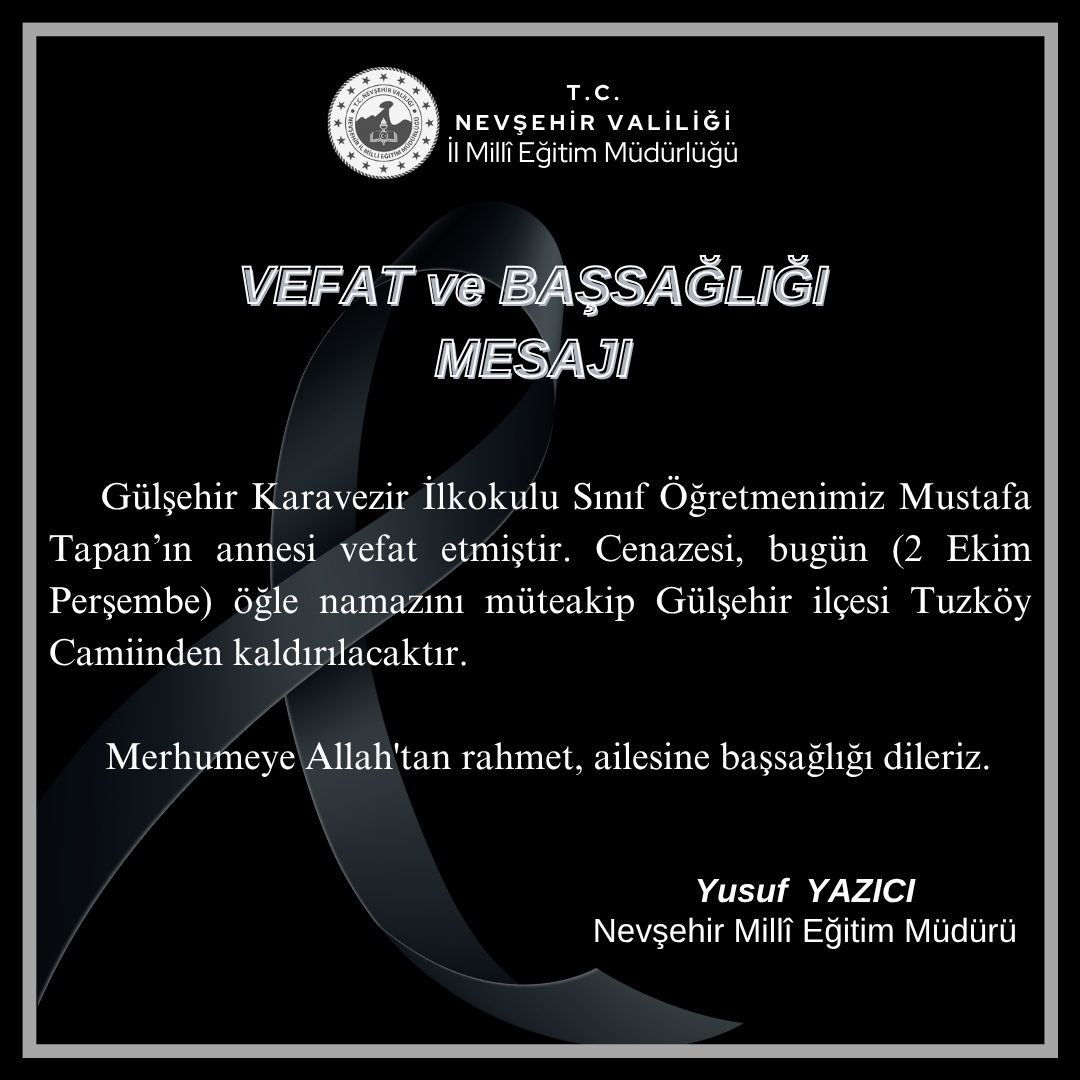 Gülşehir Karavezir İlkokulu Sınıf Öğretmenimiz Mustafa Tapan'ın annesi vefat etmiştir. Cenazesi, bugün (2 Ekim Perşembe) öğle namazını müteakip Gülşehir ilçesi Tuzköy Camiinden kaldırılacaktır. Merhumeye Allah'tan rahmet, ailesine başsağlığı dileriz.